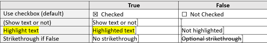 To specify the required behaviour different from showing a boolean value as a checkbox, replace the checkbox by the required formatting, e.g. (Show text or not) between round brackets indicating optional text in the True and False columns in the second row.