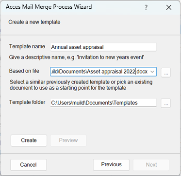 Eventually, you will be making many different types of document. It is important to give the template a name that reflects the type or use of the document in case of reports it will probably be derived from the report title. For example, the report ‘Asset appraisal 2023’ suggests the template name ‘Annual asset appraisal’. This name will also appear in the Access Mail Merge dialog.