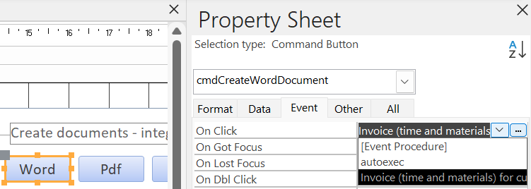 - In the sheet’s Other tab, give the button a suitable name (cmdCreateWordDocument).